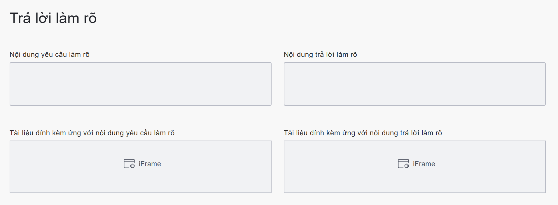 | 19 | Mục Tài liệu đính kèm ứng với nội dung yêu cầu làm rõ | File upload / Attachment (Đính kèm tệp) | Không bắt buộc | - Hiển thị tài liệu đính kèm ứng với nội dung yêu cầu làm rõ (STT 18). - Không cho phép thêm mới/sửa/xóa dữ liệu | Thể hiện tài liệu liên quan đến nội dung yêu cầu làm rõ (nếu có). |