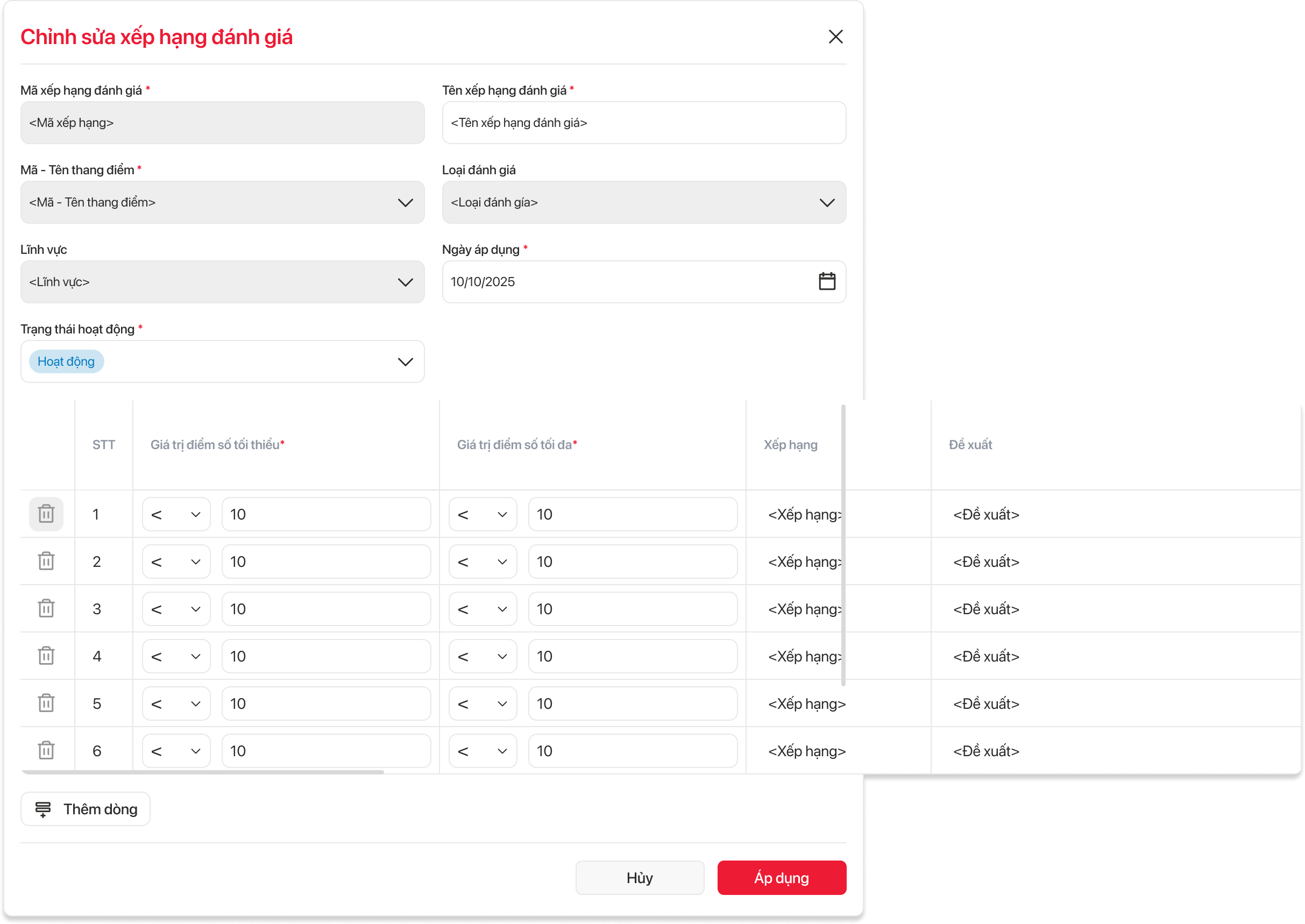 | 6 | Đề xuất | Văn bản (Text) | Bắt buộc | Cho phép chỉnh sửa đề xuất tương ứng với từng xếp hạng | Thể hiện đề xuất tương ứng với số điểm xếp loại đạt được |