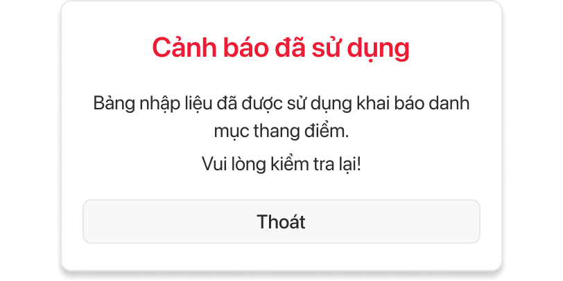 Là admin nghiệp vụ, tôi muốn hệ thống cảnh báo trong trường hợp xóa thang điểm, bảng nhập liệu đã được sử dụng