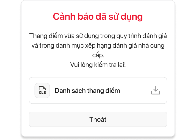 3.4.2.1. Cảnh báo Thang điểm đã được sử dụng trong đánh giá nhà cung cấp trong quy trình đánh giá nhà cung cấp. Mẫu pop-up và file danh sách trả ra
