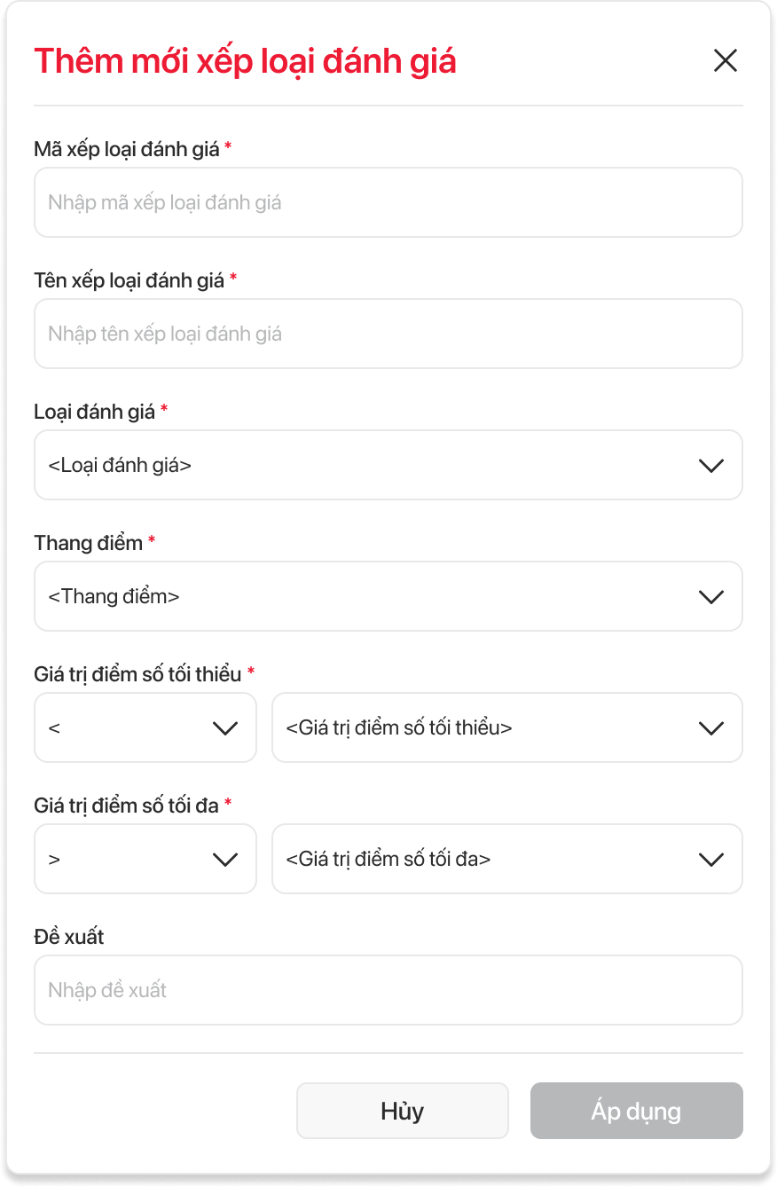 | 2 | Tên xếp hạng đánh giá | Văn bản (Text) | Bắt buộc | -Cho phép nhập tên xếp hạng đánh giá | Thể hiện thông tin tên xếp loại đánh giá |