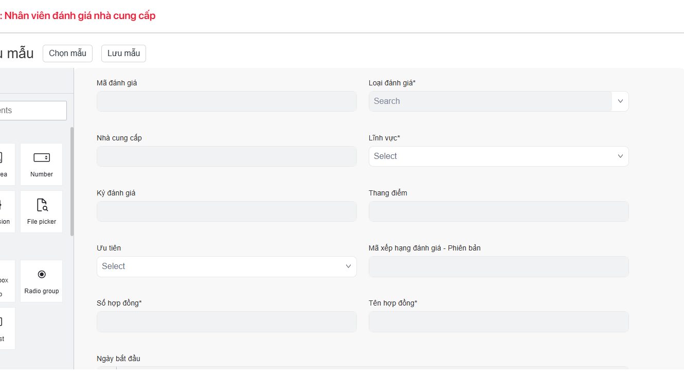 | 1 | Mã xếp hạng đánh giá - phiên bản | Văn bản (Text) | Đề xuất | - Dữ liệu được lấy theo trường Mã xếp hạng đánh giá từ trường "Mã xếp hạng đánh giá" từ 2725_User Story - Nhân viên mua hàng tạo yêu cầu đánh giá NCC, Nhà thầu Không cho phép được chỉnh/sửa/xóa | Thể hiện thông tin mã xếp hạng đánh giá nhà cung cấp |