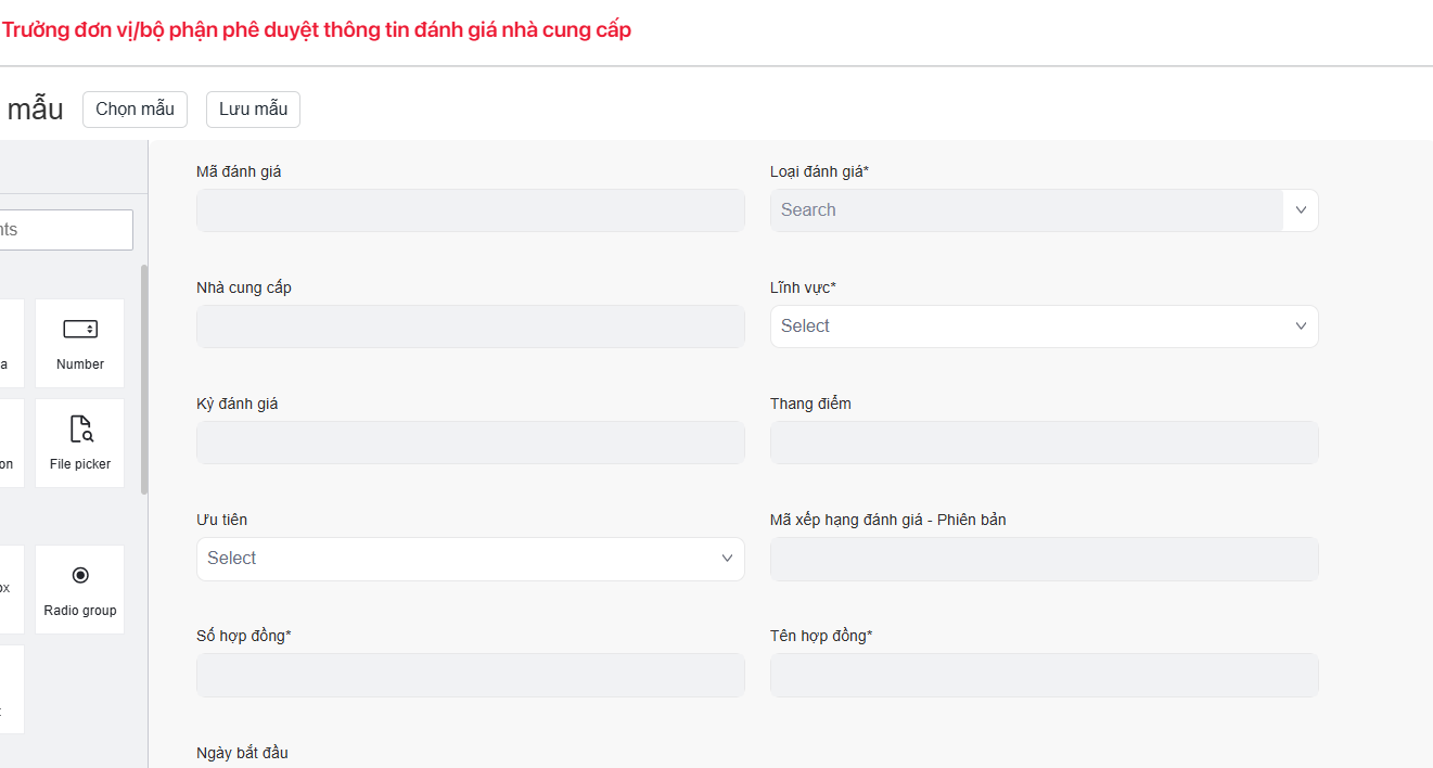 | 1 | Mã xếp hạng đánh giá - phiên bản | Văn bản (Text) | Bắt buộc | - Dữ liệu được lấy theo trường Mã xếp hạng đánh giá từ trường "Mã xếp hạng đánh giá" từ 2511_User Story - Nhân viên đánh giá nhà cung cấp, nhà thầu Không cho phép được chỉnh/sửa/xóa | Thể hiện thông tin mã xếp hạng đánh giá nhà cung cấp |