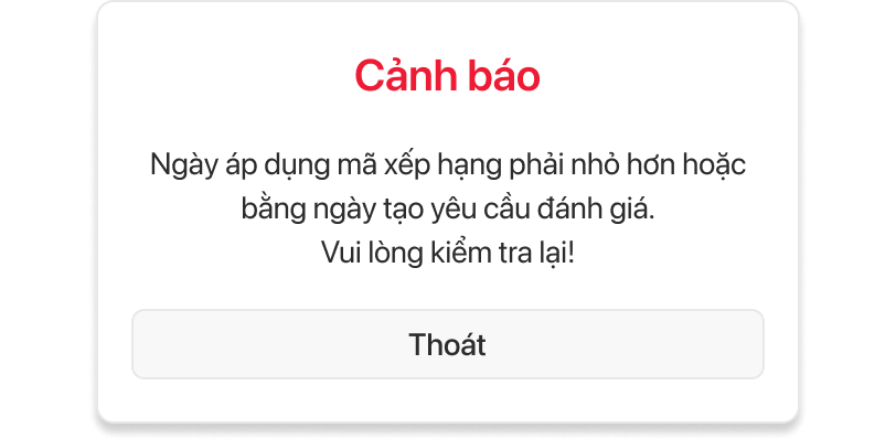 Màn hình Pop-up cảnh báo: Ngày áp dụng mã xếp hạng đánh giá > ngày tạo yêu cầu đánh giá