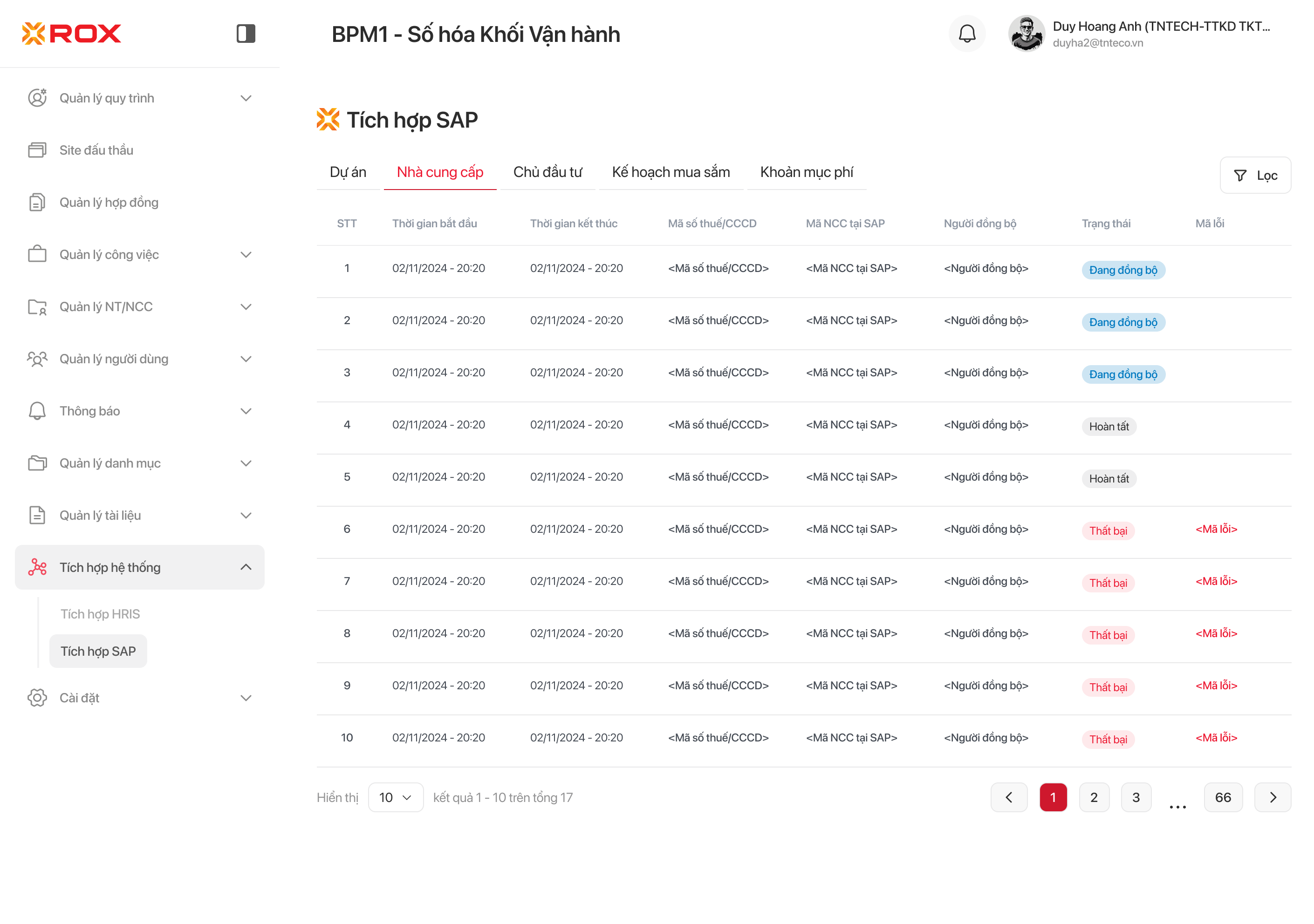 | Thể hiện mã lỗi khi đồng bộ thông tin nhà cung cấp từ hệ thống BPM sang hệ thống SAP. |