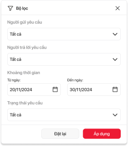| 4 | Trạng thái yêu cầu | Lựa chọn (Select) | Không bắt buộc | - Cho phép người dùng nhấn để chọn giá trị trạng thái từ danh sách thả xuống của trường. - Hành vi hệ thống khi thực hiện lọc như sau: