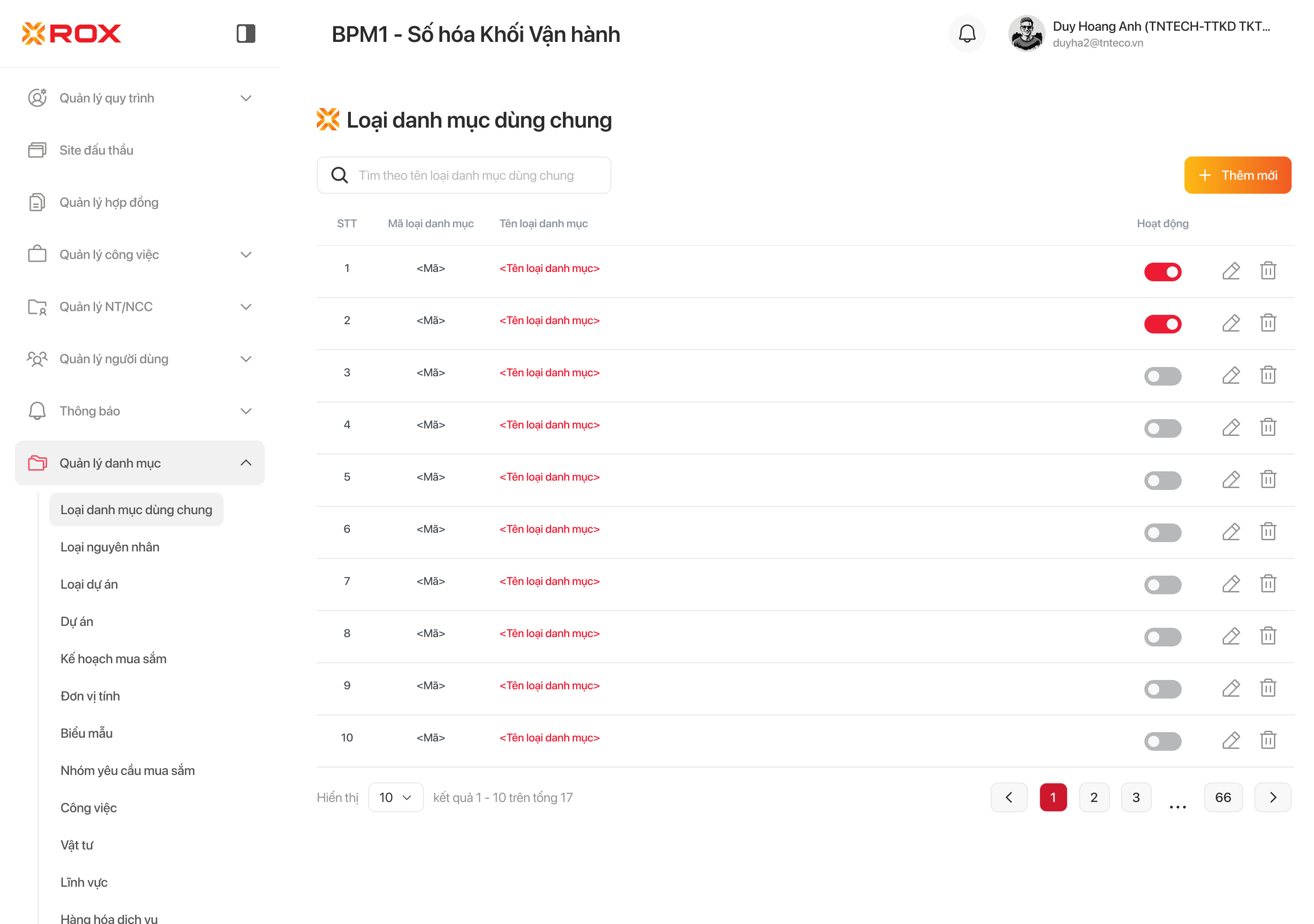 | 9 | Nút Xóa | Nút chức năng (Button) | Không bắt buộc | - Cho phép người dùng thao tác đối với CHỈ những bản ghi loại danh mục dùng chung đang ở trạng thái Không hoạt động (Inactive/Off). -Nếu chọn bản ghi không được xóa, hệ thống sẽ hiện thông báo (Toast):